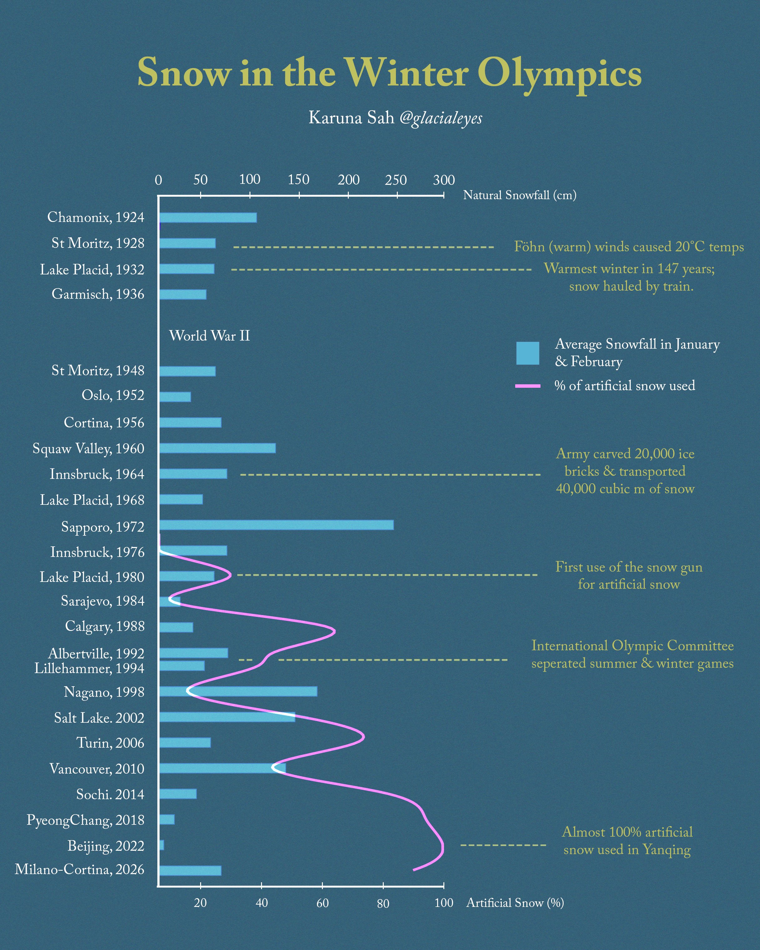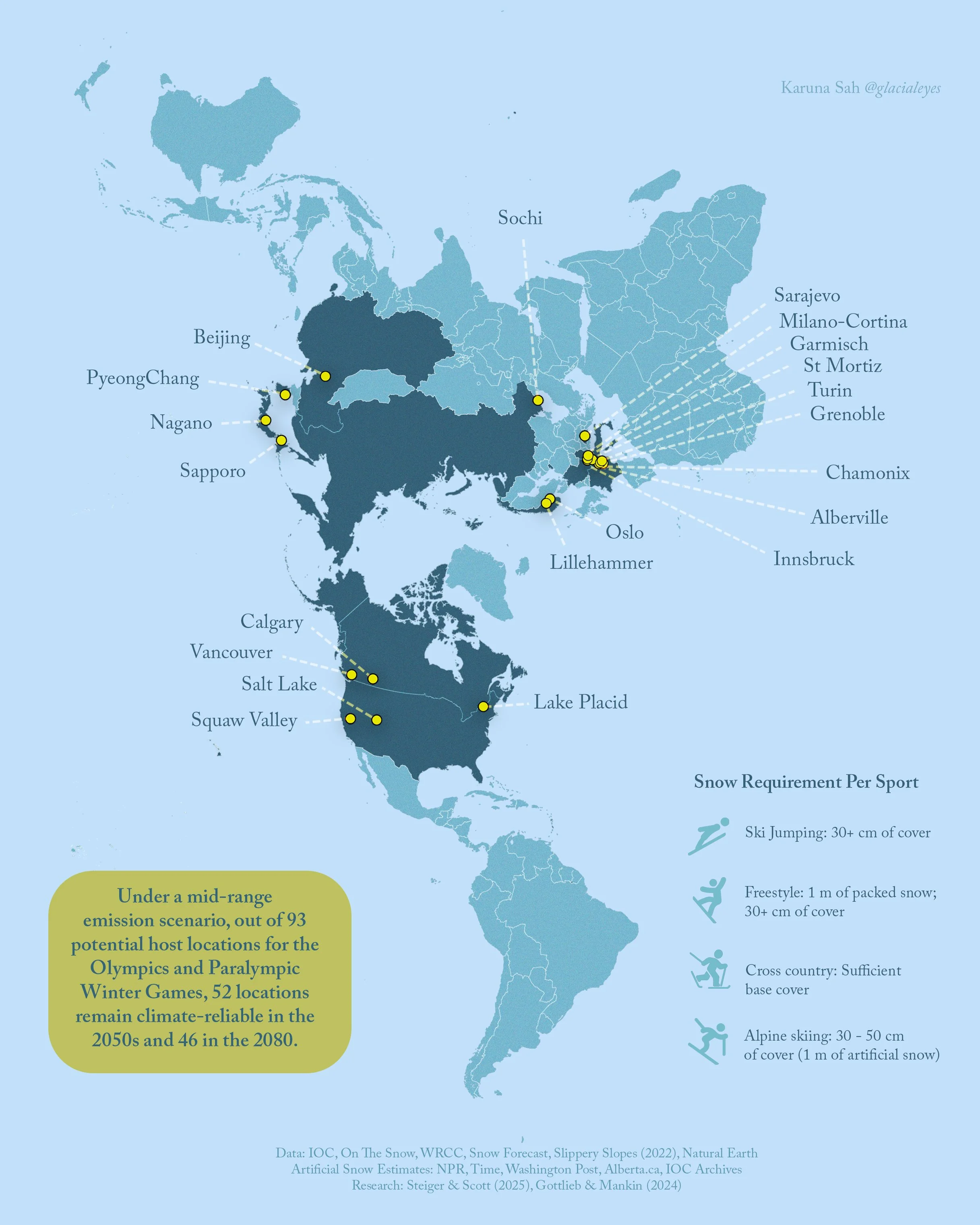 Amidst talks of the IOC moving the winter games to January for more reliable snow, let’s look at general trends. Artificial snow making made it’s olympic debut at Lake Placid in 1980, and hosts are increasingly reliant on it today. According to reports, 95% of ski resorts worldwide depend on it. As I was looking at snowfall data from ski areas, the general trend showed that January gets more snowfall than February across host sites. And with only half of the potential host sites to be climatically reliable by 2050, an earlier start does make logistical sense. A 2024 Nature study on the links between snowpack loss and humans concluded that 82 of 169 major river basins in the Northern Hemisphere experience snowpack loss, and 31 are confidently attributed to human influence. They found the critical threshold to be -8 °C; for every degree increase in temperature, snow becomes marginally more sensitive, non-linearly, to melting and loss. The data is clear. The systemic response, less so.